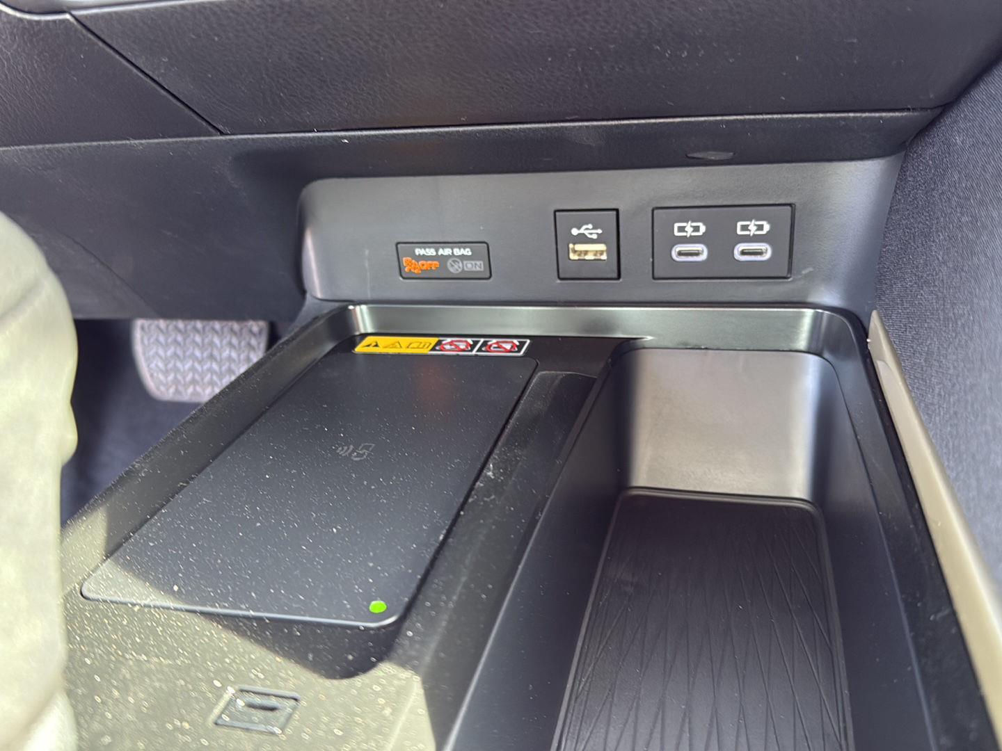 - Five USB ports: one USB-A media port and two USB-C charging ports up front, with one USB-A and one USB-C charging port in the rear